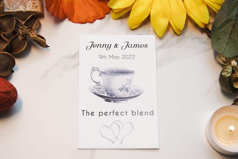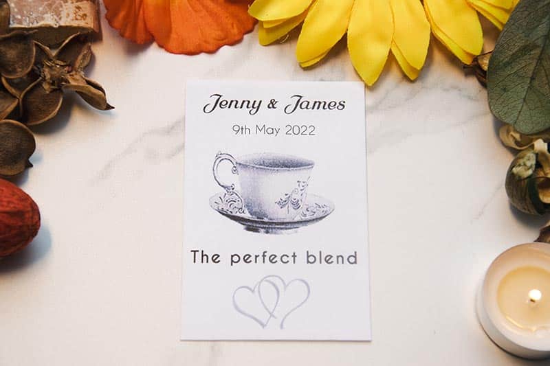 Description: For the perfect “tea-total” wedding favour, look no further than our Personalised Wedding Tea Bags. Celebrating “The Perfect Blend,” these favours are ideal for guests who prefer a cozy night in to a garden project. Each favour contains a high-quality tea bag, beautifully presented in a custom-printed envelope featuring your names and wedding date. It’s a warm, comforting way to say thank you and a great alternative for weddings where seeds might not fit the vibe.